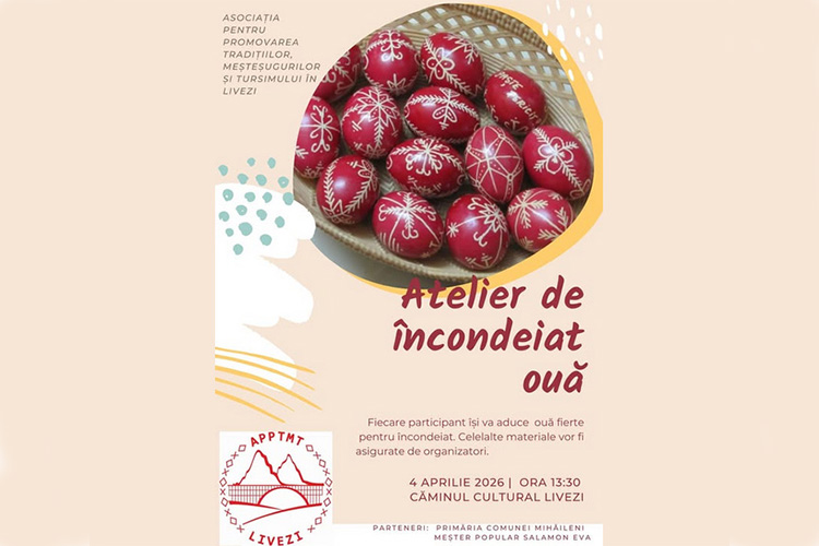 Asociaţia pentru Promovarea Meşteşugurilor şi Tradiţiilor din Livezi, în colaborare cu Primăria comunei Mihăileni şi meşterul popular Salamon Eva, vă invită sâmbătă, 4 aprilie, începând cu ora 13:30, la Căminul Cultural din satul Livezi pentru a participa la tradiţionalul Atelier de încondeiat ouă.