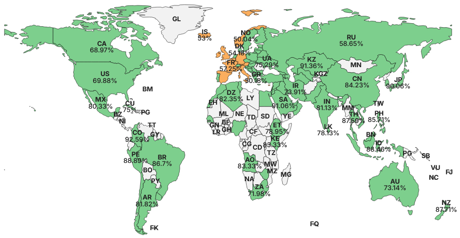 În toate celelalte ţări (83), preferat a fost Nicuşor Dan, inclusiv în Federaţia Rusă (58,65%, dar unde au votat doar 133 de persoane). Procentual, s-au remarcat Uzbekistan (97,14%, cu doar 35 de votanţi), Coreea de Sud (95,34%, cu 279 de alegători), Kazahstan (91,36%, cu doar 81 de alegători), Japonia (90,06%, cu 1.016 votanţi), Singapore (91,14%, cu doar 316 alegători). În Republica Moldova au votat 157.188 de persoane, iar 88% (138.320 de alegători) l-au preferat pe Nicuşor Dan. În SUA, aproape 18.000 de români (69,88%) au votat pentru Nicuşor Dan. (sursa: prezenta.roaep.ro)