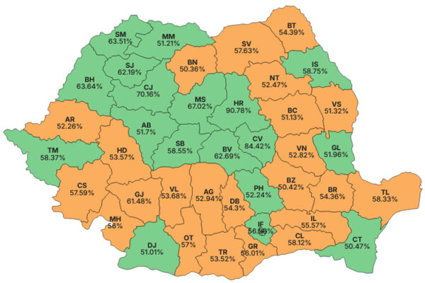 În Covasna a câştigat cu 84,42%, în Cluj cu 70,16%, în Bihor cu 63,64%, iar în Satu Mare cu 63,51%.